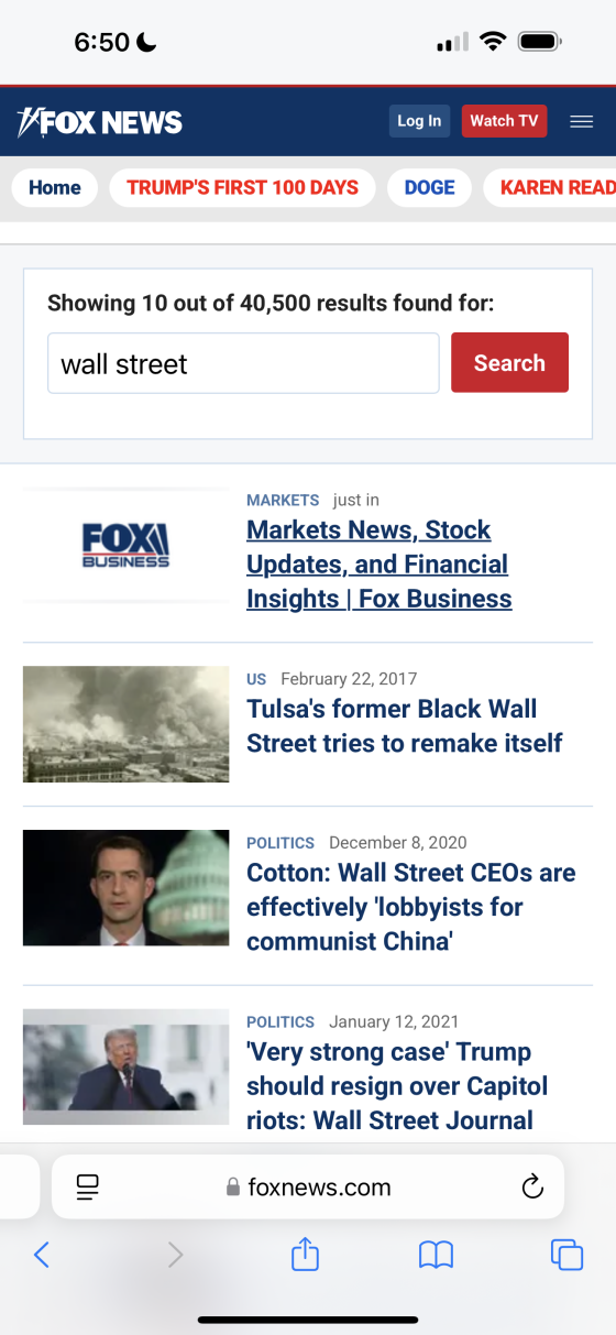 Searching "wall street" in the Fox New site- most of the links are years old, but the first match seemed exactly relevant. Especially when the "Market News, Stock Updates and Financial Insights" link leads to a single page telling me "Something has gone wrong..."