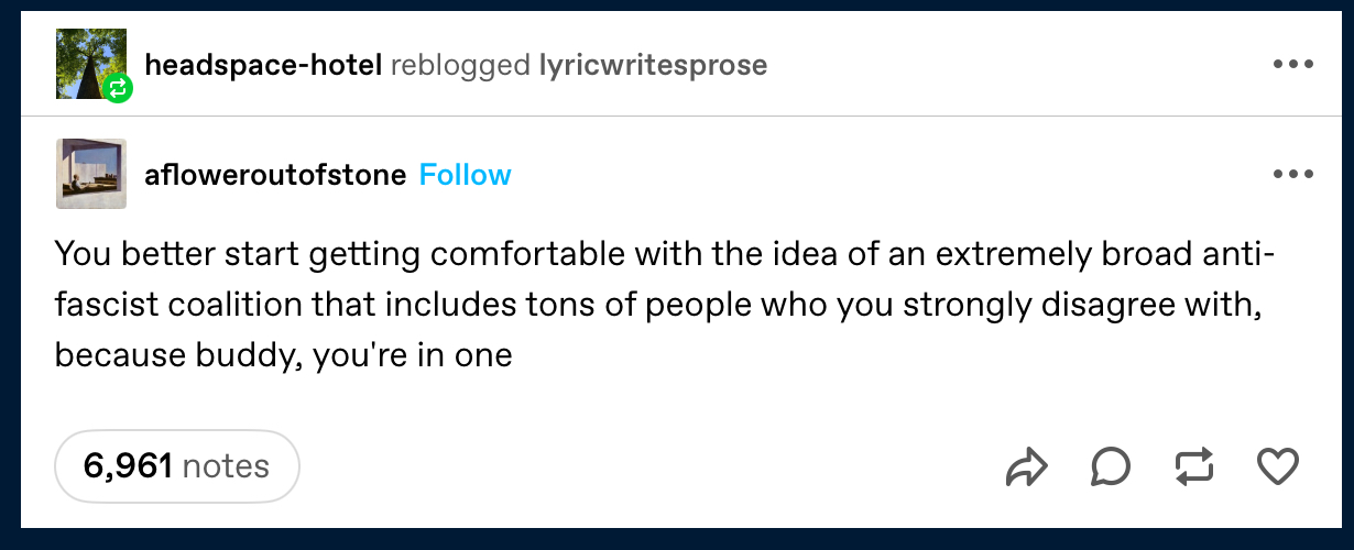 You better start getting comfortable with the idea of an extremely broad anti-fascist coalition that includes tons of people who you strongly disagree with, because buddy, you're in one