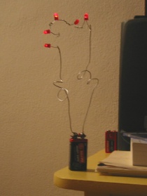 So yesterday I went to a workshop run by the Jackal art group. They're into scavanging technology and subverting and repurposing it. The workshop took a while to hit its stride but was good once more participants showed up. I helped make some "stomp pads", electric switches made of cadboard, foil, tape, and foam, that they were wiring up to a PC to do sound effects. (They also had a kids toy electronic guitar wired to video clips of Guitar Gods, so you could play random clips as well as speed the clips up or down.) I also made an LED "light sculpture" for Mo that you see here; 9V battery, battery socket, wire, LEDs. Supposedly if it was just one LED it would be at risk of the LED blowing up, hopefully five should be ok. Man, I hadn't soldered since the gifted and talented special class in fourth grade! (Thanks Ranjit, who passed me word of their Boston Cyberarts workshop; he was thinking about going but decided not to, but dropping his name worked pretty well too.)Quote of the Moment