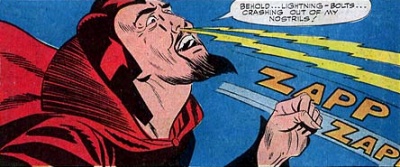 --Also pointed out by Bill, this panel of powerful nostril superpowerness, from the short-lived comic Fly Man.