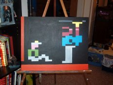 At Philly Classic, a woman named Aimee Dingman had a bunch of Atari-themed-art, namely, pixel-perfect acrylic paintings of famous atari characters and scenes. I didn't buy one, they price/size ratio was just one scale too large for me, though I was thinking using screenshots and a good photo printer might make some interesting results, in a rip-off kind of way. (Just for my own amusement and decoration.) Actually, as seen in the background of that photo with me and Howard Scott Warshaw, AtariAge printed up some large posters of the various cartridge fronts. I wonder where I could get access to something that could print that size, and how much it would cost...Art of the Other Moment
