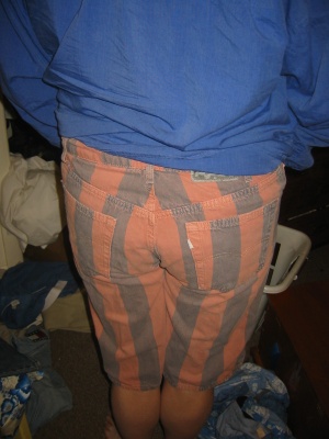 Apologies for this next photo, because it's wrong on a few levels. Foremost of which are the shorts themselves...Rust-and-grey denim shorts in a candystripe pattern. They're really something, huh? I bought them years ago at a TJ Maxx I think. One reason I kept 'em was a memory of my friend Rick saying he want pants like Towa Towa Tei on the Deee-lite World Clique Album cover, and the pattern was similar, if not the palette.