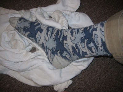 I've been trying to get rid of some of the excess from my wardrobe...especially socks. I had far too many white athletic socks and dark blue "business casual" socks...many of which didn't quite have a mate. Very tough to find a pair that I could rely on being a good set, especially bleary eyed in the poor morning light. So I weeded the stragglers out and generally cut down.I instituted a strict "socks without partners must go!" policy, and one of the unfortunate victims was this lone M.C. Escher sock of interlocking lizards...I loved 'em so much, I think they might be what I wore to prom...