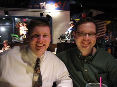 Now, on this trip, last night I had a very odd meal... Chris suggested we go to ESPN Zone. I thought that the series of tables, each with its own small TV was a little odd, but our actual dining experience was even stranger... both of us sitting in a seperate recliner with a built-in swivel table, in front of a GIANT TV screen... I have to say, watching "talking head" sports coverage/interviews on a TV the size of most movie screens is...well, kind of tedious really. The giant screen was then flanked by a total of 12 smaller screens with different games going. (I would've thought almost any game would be better fare than talk talk talk, but what do I know, I'm not THAT much of a sportsfan.)