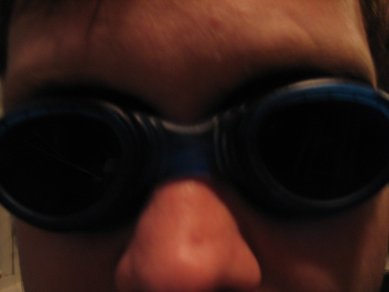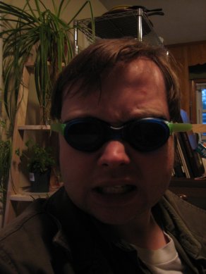 Not so much "cute" as "weird", me messing around with EB's swim-goggles while waiting for him to pick up some clothes from home: