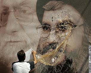 From CNN, "A man cleans a poster of Hezbollah chief Nasrallah." At the risk of being completely culturally insensitive, I'd say one thing I like about the West currently is that we DON'T have giant-head posters of political and group leaders up and about for the most part. Even the most numbskulled George W. supporter limits it to a "W" bumpersticker, or in the most extreme cases a small portrait on top of the TV.