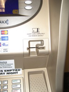 This is an ATM we have at my office building. You insert your card magnetic stripe down, as the picture indicates, but every time I use the machine I have to stop and think about it. I finally realized why: it's a matter of perspective. From where I'm standing, I can't see the damn stripe on the actual card as it is being properly inserted, but the drawing is from a toddler's-eye perspective in order to show the stripe directly.