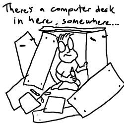 I realize that I've lost some of the sense of "NO MERCY" that I had last week. I stacked up 3 computer keyboards. One is a Microsoft split keyboard that I will likely take into my new job, so it gets a pass. The other two are normal, flat ones; I think they came bundled with PCs but I put them aside in favor of the split ones. NO MERCY! When you A. don't need it and B. could buy a replacement for $4 at Microcenter if you DID need it, there's no way that that item is "paying its rent". (The question then is, do thrifts accept them or not.)