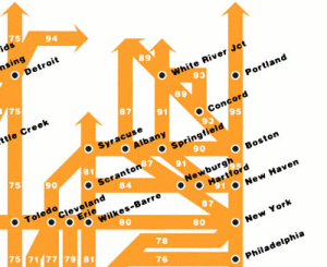 | --Northeast excerpt of Chris Yates' brilliant subway-map like simplification of the Eisenhower Interstate System. (via boingboing) |
