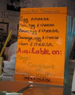| --The Gail Ann Coffee Shop, right across the street from me. Great donuts, but this sign made me think of that Monty Python skit. "Err... do you have something without cheese in it?" |