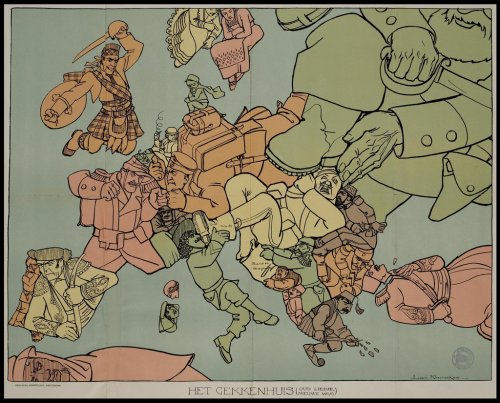 --from Dogs of War, a collection of WWI anthropomorphic(and caninepomorphic) maps of Europe about to go to war. I love the Escher-like quality of this one by Louis Raemaekers, it's less cluttered and free-er in terms of boundaries than most of the others. Plus, that leaping highlander for the British Isles is pretty great.