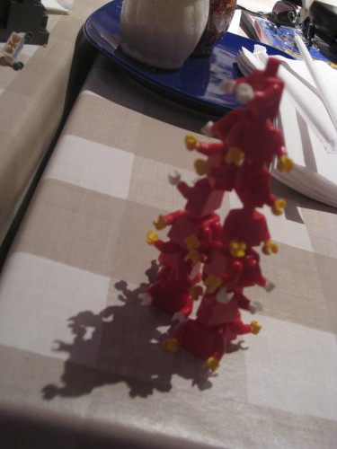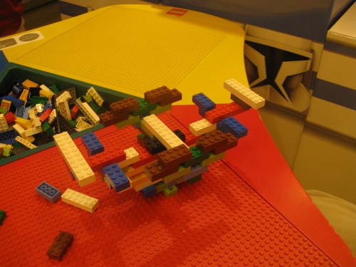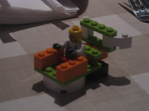 Most of the folks (9 or 10 nerdy-ish guys, though I heard rumors of women members of the group) bought a kit or two, or took from the "Pick-A-Brick". I decided to buy one of the grabbags. The bag had some odd remnants, a lot of light green and orange bricks, and little white "macaroni" curvy blocks. I made a vehicle:
