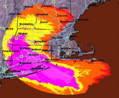 The photographic negative of Boston's radar map weather from radar.weather.gov looks a bit like Pac-Man about to eat Boston...
