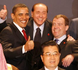 | --Obama, Berlusconi, Medvedev (and some other guy below) at the G-20 summit. I'm all for projecting confidence, but this seems to be veering dangerously near a Bush-like "Mission Accomplished" disconnect. |