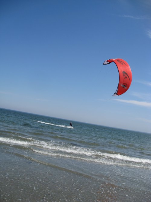My bud cmg and I walked the Revere shore yesterday, the first summerish day of the year. We saw this guy doing some kind of surfing with a giant kite... though a minute of googling implies the sport is, err kitesurfing. He seemed really excellent at it, keeping his kite out of the water, and getting a nice long cruise with and against the wind, without having to stop and paddle back out very much. It seemed like the most technical surfing fun you could have with such limited waves.