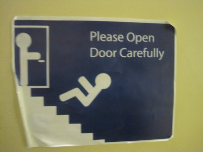 The parking garage near the hotel had this. The sign outside the door said "Please Use Other Doors". Yeah, that first step, she's a doozy.