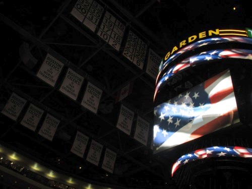 The rafter banners during the Star Spangled Banner.