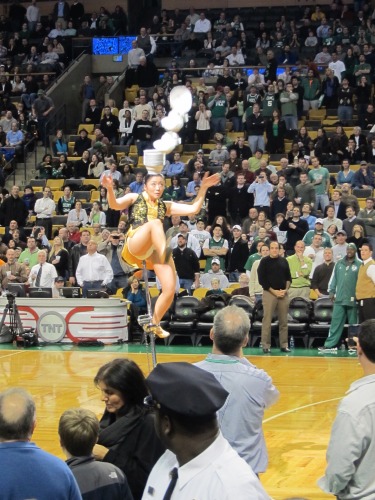 Halftime was a gal from the Red Panda acrobats who kicked bowls onto her head. While on a unicycle.