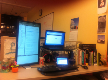 My desk at work! Rockin' the Vertical Second Monitor, Bonus Baby Third, and Sea Monkeys.