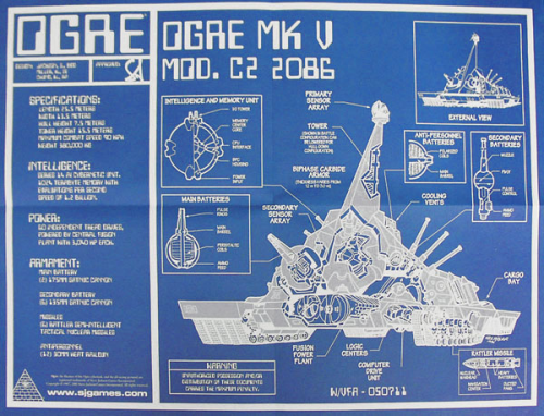 --I really liked Steve Jackson's "OGRE" boardgame back in the day, even if it seemed unbalanced -- at least the way my friends and I played. The game is about a GIANT automated tank rolling through more conventional forces to demolish their HQ... I think the non-OGRE side could shoot the treads off and win consistently.(via)