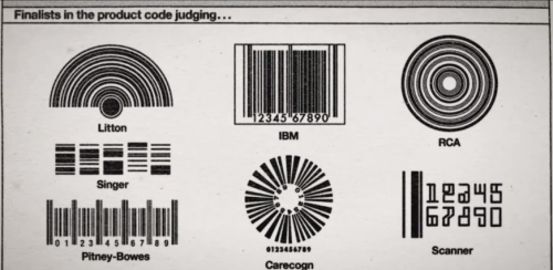 --A still from last entry's IBM Centennial video -- these were some of the final candidates for the UPC. I'd love to know more about the physical characteristics of some of these like, especially the circular ones. Also the font on that one (probably meant to be characters that are machine readable, like with checks) is intriguing. I know the normal UPC code has some cool properties so it can be read either way.