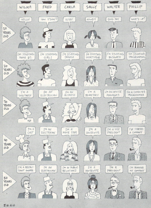 This image accompanied some odd type in game "One in Six - Take your Pick", with the program by high schooler Steve Horowitz and the puzzle and illustration by Josh Gosfield. The illustration probably warped by view of gender and careers at a tender age.