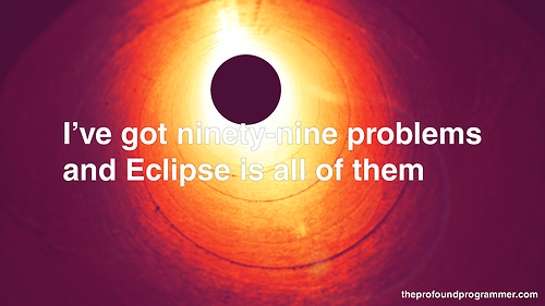 --from The Profound Programmer. Kind of a web 2.0 version of "Demotivators". (Eclipse is an free editor for the Java programming language that luckily I don't have to use right now... and of course "99 Problems" is a reference to a Jay-Z's hip hop work.