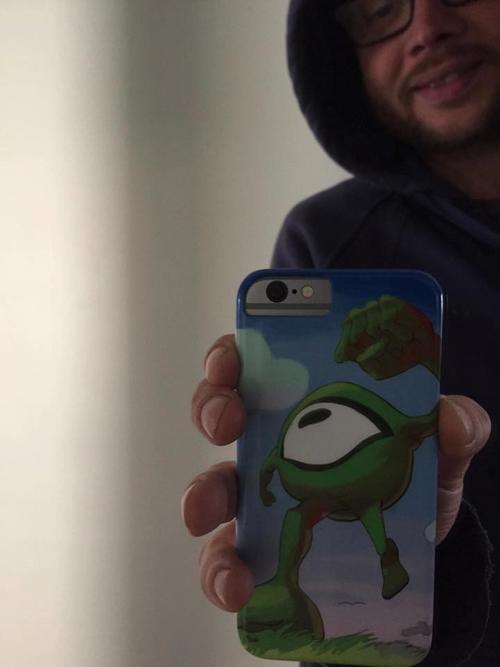 iPhone 6 finally arrived! I think as a an object of design, it's probably the most boring iPhone yet; just a big video billboard with rounded edges. The good part is that it's thinness makes a case less unpleasant, so on a whim months ago I had a custom case made with my old James Harvey Alien Bill commission. (This is only the plain 6; it might look larger so close to the mirror...)
