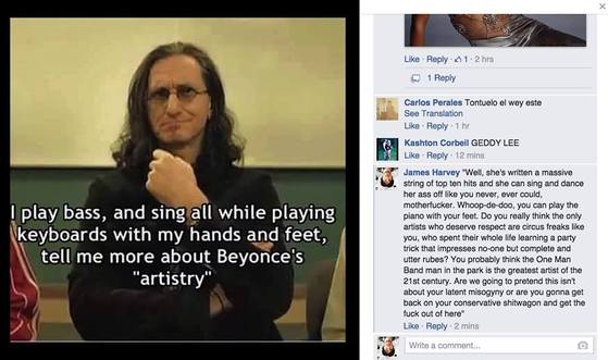 Well, she's written a massive string of top ten hits and she can sing and dance her ass off like you never, ever could, motherfucker. Whoop-de-doo, you can play the piano with your feet. Do you really think the only artists who deserve respect are circus freaks like you, who spent their whole life learning a party trick that impresses no-one but complete and utter rubes? You probably think the One Man Band man in the park is the greatest artist of the 21st century. Are we going to pretend this isn't about your latent misogyny or are you gonna get back on your conservative shitwagon and get the fuck out of here"(I do not think the first quote was authentic)