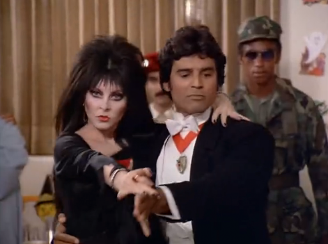 I found this picture of Elvira dancing with Erik Estrada for Melissa but I thought it was too important not to share with you all (via This CHiPs episode page . That is also good to see if you want to see Ralph Malph from Happy Days play a regretful version of a Gene Simmons-type Satantic Rocker)