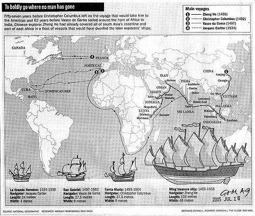 There was an image in "Sapiens" that rather exaggerated the difference between Chinese Explorer Zheng He's flagship and what Columbus was sailing, but the difference was still impressive: