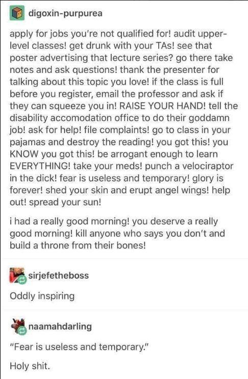 For me and my fixed mindset, it’s weird, the feeling of self-hatred referenced in the comic is more “you can’t grow unless you declare your previous self an idiot for getting yourself into these patterns in the first place"… but your previous self was probably about as smart as you are now! (See Tallulah Bankhead's "If I had to live my life again, I'd make the same mistakes, only sooner.")