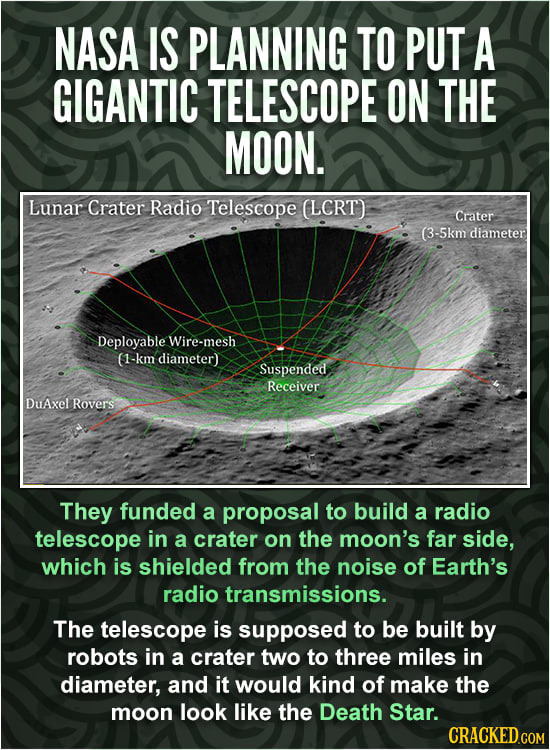 via Cracked - Man, that's so Evil Villain / Death Star looking - if we have literal Flat Earthers, there's gotta be some contingent who won't believe that the moon won't just rotate around once this is built and point a big laser at Earth... (more information from NASA)