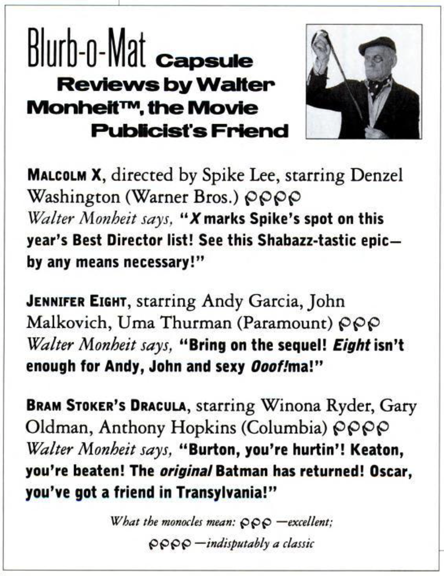 Sometimes I feel like Walter MonheitTM, the Movie Publicist's Friend, in the much lamented Spy magazine: