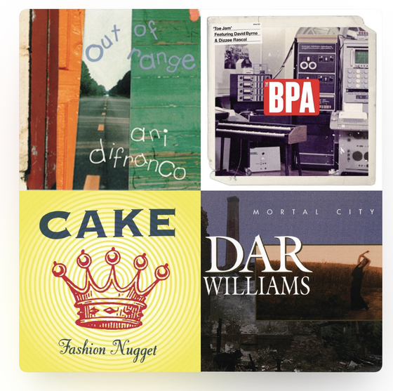 I think it's picking "A,B,C,D" so in my case, Ani "Buildings + Bridges" DiFranco, BPA ("Toe Jam" with David Byrne - fun sort of NSFW video for that), CAKE ("The Distance" was my senior solo), and Dar "Cool As I Am" Williams.