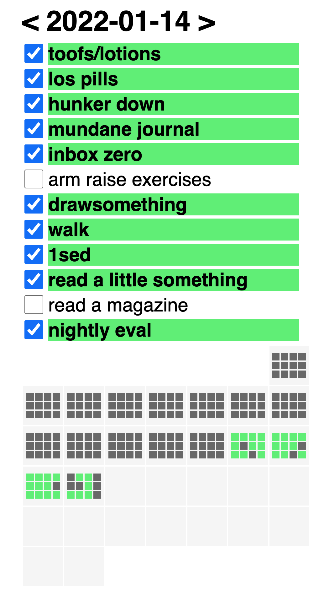 On my devblog, I wrote about my new daily todo tracker and what I've learned about the usefulness of using different methods of recording/tracking todos: ad hoc + soon vs daily habits vs long term + projects. Trying to put them all in one todo app was clogging things up and adding a strain to my life.