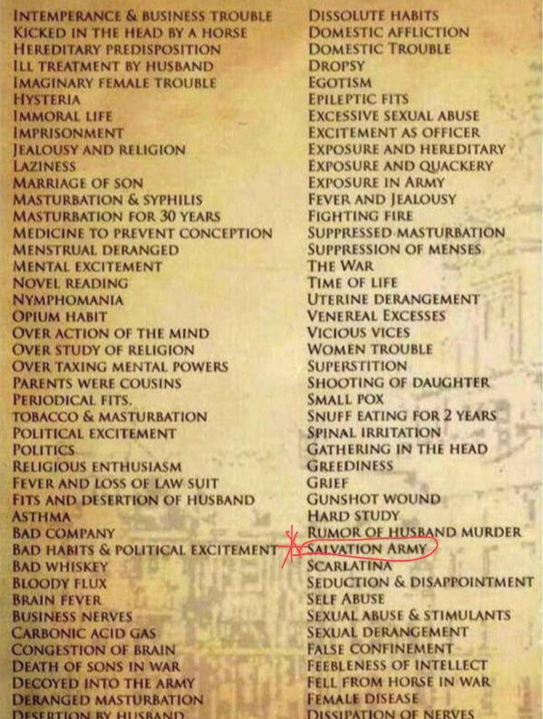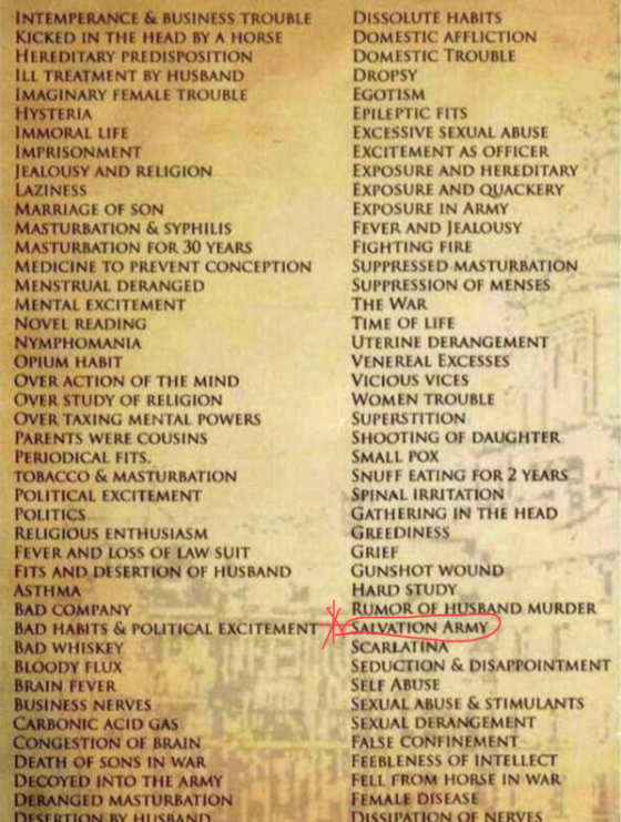 "Salvation Army" among the reasons Reasons for admission to a West Virginian lunatic asylum.