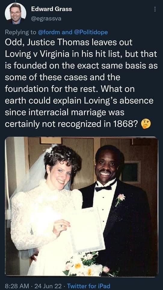 UPDATE and clarence thomas, that pubic hair on coke can fuck wit, sends signs that he'd like gay marriage and contraception to be on the table to. Fuck your rights, better hope you're in a state you like , and that the authoritarians on top don't specifically override there.