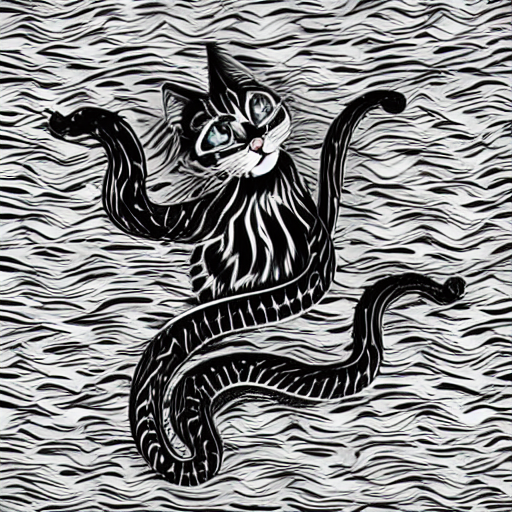 diffusionBee, "a cat with black and white features and tentacles from a snake's body rising out of water in a photorealistic style"