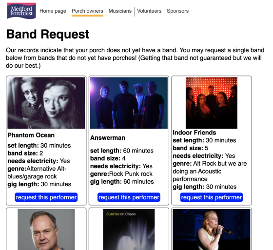 One of the biggest questions for a porchfest is whether they are "B.Y.O.Porch" (like Somerville), or if their vision of inclusion means more matchmaking (like JP, the first city I started doing these for) or some permutation of the two. My newest site, Medford, requested a new feature where we could send a link to porches that didn't have any band associated with them, allowing them to request a band from those that didn't yet have a porch. I was able to come up with the page thumbnailed here in less than a day of work, along with the update to my bulk mailer system to send the link (with appropriate authentication) to just those porches.