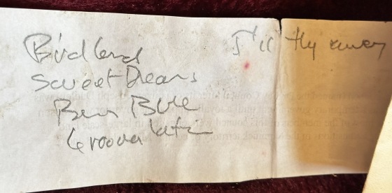 Trying to figure out the 3rd song he listed here along with "Birdland" "Sweet Dreams" and "Groovulation" - and because of this note his musically talented family and upstairs tenant did a lovely version of "I'll Fly Away" and had all gathered sing along.