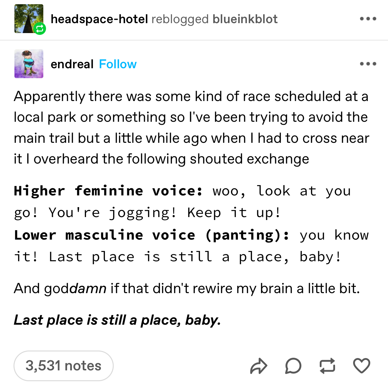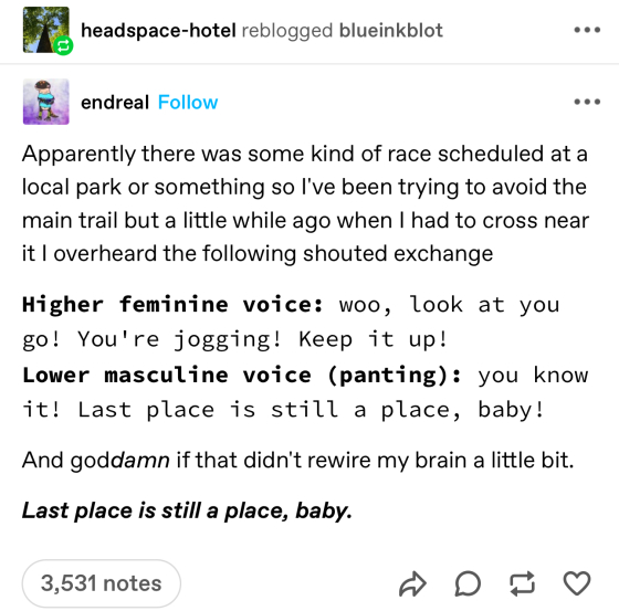 I love the community of tumblr and it's my favorite source of stuff to repost on my blog - but I haven't figured out how to get "followed", so it's mostly a read-only medium for me so far.