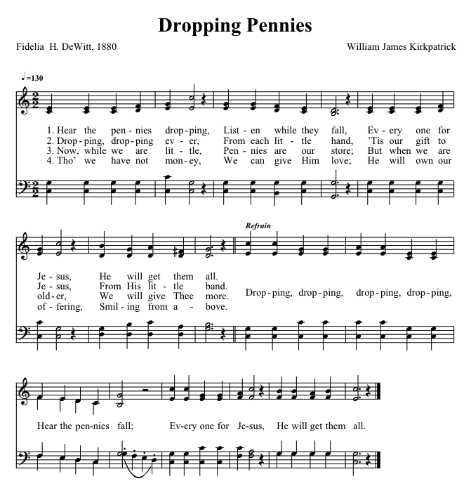 weird flashback... I remember Glens Falls Sunday School, we would sing the chorus of this song (dropping dropping dropping dropping hear those pennies falls, every one for Jesus, he shall have them all...") and then leading into "Happy Birthday to you". There was some little ritual where I think the birthday kid would put in as many pennies as their age or something? And maybe pick out a little present? (like, a colorful pencil or something) I don't quite recall...